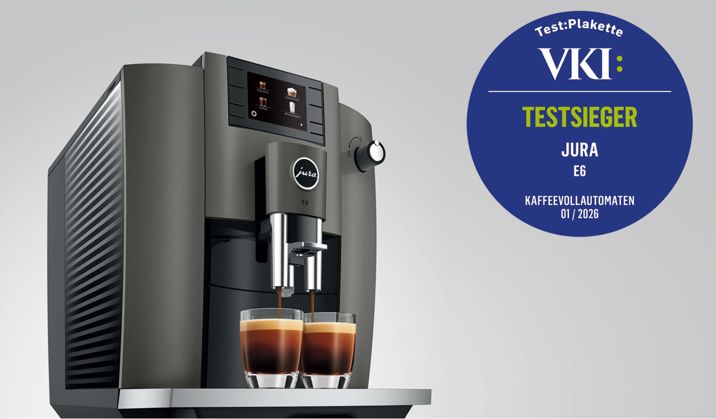 Wenn Schweizer Hightech auf preisgekröntes Design trifft, entsteht ein Kaffeeresultat, das keine Wünsche offenlässt. In der Ausgabe des Magazins „Konsument“ (01/2026) wurden elf Kaffeevollautomaten intensiv auf ihre Espresso- und Cappuccino-Qualitäten geprüft. Das Ergebnis ist eindeutig: Die Jura E6 erfüllt alle Anforderungen mit Bravour und wurde mit der Bestnote „Gut“ (70 Punkte) zum Testsieger gekürt. Erstklassige Qualität, die man schmeckt Im Zentrum der Bewertung stand die Qualität der zubereiteten Spezialitäten, die allein 60 Prozent des Urteils ausmachte. Drei erfahrene Kaffee-Sommeliers bewerteten hierbei Aussehen, Geruch, Geschmack und Mundgefühl. Die Jura E6 punktete dabei vor allem durch: Hervorragende Espresso- und Cappuccino-Qualität: Die Spezialitäten überzeugten die Experten durch Konsistenz und Aroma. Präzise Mahltechnik: Der integrierte Professional Aroma Grinder garantiert ein gleichmäßiges Mahlergebnis für maximales Aroma. Feinporiger Milchschaum: Dank der speziell entwickelten Milchdüse und der Easy-Cappuccino-Funktion gelingt der Publikumsliebling in Perfektion – mit einmalig weichem Schaum auf Knopfdruck Individueller Genuss und smarte Bedienung Ein moderner Vollautomat muss sich den Vorlieben seiner Nutzer anpassen. Die Jura E6 bietet daher vielfältige Möglichkeiten zur individuellen Feinjustierung von Mahlgrad, Kaffee- und Wassermenge sowie der Brühtemperatur. Die Bedienung bleibt dabei denkbar einfach: Intuitives Farbdisplay: Sechs ideal platzierte Tasten ermöglichen die unkomplizierte Zubereitung Ihrer Lieblingsspezialität. Smarte Steuerung: Die E6 ist mit der Jura-App J.O.E.® kompatibel, wodurch Sie Ihren Kaffee bequem via Smartphone steuern können. Langlebigkeit im Fokus: Neben dem Geschmack lobten die Tester auch die Handhabung, die Reinigungs- und Entkalkungsprozesse sowie die gute Reparierbarkeit des Geräts. Zeitloses Design für jede Küche Die Jura E6 besticht durch ihre geradlinige Geometrie und edel verchromte Akzente, die ihr eine ruhige Eleganz verleihen. Sie ist in drei zeitlosen Farbvarianten erhältlich, die sich harmonisch in jedes Küchenambiente einfügen: Piano Black, Platin und Dark Inox. Erleben Sie den Testsieger selbst! Besuchen Sie Ihren expert-Fachhändler vor Ort und lassen Sie sich von der Qualität der Jura E6 begeistern.