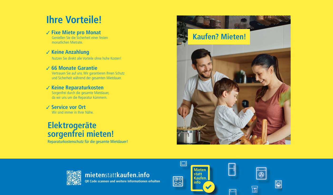 Stellen Sie sich vor, Sie haben jederzeit topaktuelle Haushaltsgeräte, müssen sich bei Reparaturen keine Sorgen um teure Rechnungen machen und bleiben selbst im Fall eines Totalschadens finanziell entspannt. Genau das ist jetzt möglich! Sichern Sie sich Ihr Wunschgerät schon für einen günstigen, festen Monatsbetrag. Mit der All-Inclusive-Miete sind Sie während der gesamten Mietzeit bestens abgesichert – Reparaturen oder Servicekosten? Für Sie völlig kostenfrei! Mieten statt kaufen – clever entscheiden und entspannt leben! Warum alles auf einmal bezahlen? Mit der All-Inclusive-Miete genießen Sie viele Jahre lang stressfreie Nutzung Ihrer Haushaltsgeräte – dank eines günstigen, fixen Monatsbetrags. Schon mehr als 29.000 zufriedene Kundinnen und Kunden profitieren von den zahlreichen Vorteilen: Keine Anzahlung – feste Monatsrate: Bei der All-Inclusive-Miete zahlen Sie keine Anzahlung. Alles funktioniert bequem auf Mietbasis: Zur Vertragsunterzeichnung reichen ein Lichtbildausweis, eine Kreditkarte sowie ein Bankeinzug. Reparaturen? Keine Sorge! Reparaturkosten gehören der Vergangenheit an. Während der gesamten Mietdauer sind sämtliche Reparaturen durch die inkludierte Garantie abgedeckt. Sollte ein Schaden einmal nicht reparabel sein, wird Ihr Gerät selbstverständlich kostenlos ersetzt. Immer auf dem neuesten Stand: Nach 66 Monaten Mietzeit erhalten Sie automatisch ein gleichwertiges Neugerät – ohne Zusatzkosten. Der Austausch sowie die umweltgerechte Entsorgung des Altgeräts sind im Mietpreis bereits enthalten. So haben Sie stets moderne Technik im Haushalt. Flexibler Start, einfaches Ende: Ihr Mietvertrag beginnt mit der Lieferung des Geräts und kann jederzeit gemäß den vereinbarten Vertragsbedingungen beendet werden – einfach und transparent. Haushaltsgeräte mieten leicht gemacht So einfach geht’s: Lassen Sie sich von Ihrem teilnehmenden Expert Elektrofachhändler (Liste siehe weiter unten) ausführlich beraten und wählen Sie Ihr Wunschgerät aus. Ihr Expert Elektrofachhändler informiert Sie transparent über den monatlichen Mietpreis und alle Leistungen der All-Inclusive-Miete. Vor Ort schließen Sie bequem den Mietvertrag ab – schnell und unkompliziert. Die monatliche Miete wird anschließend per Bankeinzug automatisch abgebucht. Das Extra-Service für Sie Garantiert sorgenfrei – während der gesamten Mietzeit: Genießen Sie maximale Sicherheit: Alle Mietgeräte sind während der gesamten Vertragslaufzeit vollständig durch Garantie abgesichert – für eine besonders lange, sorgenfreie Nutzung. Lieferung, Anschluss & Entsorgung – alles inklusive: Unsere teilnehmenden Expert Elektrofachhändler liefern Ihr neues Gerät bequem zu Ihnen nach Hause. Auf Wunsch übernehmen sie auch den fachgerechten Anschluss, helfen Ihnen bei der ersten Inbetriebnahme und erklären Ihnen alle wichtigen Funktionen. Ihr Altgerät? Das wird gleich mitgenommen und umweltgerecht entsorgt – natürlich ohne zusätzliche Kosten. Holen Sie sich Ihr Traumgerät schon für einen kleinen, festen Monatsbetrag. Dank der All-Inclusive-Miete genießen Sie über die gesamte Mietdauer hinweg vollen Komfort – ohne versteckte Zusatzkosten.